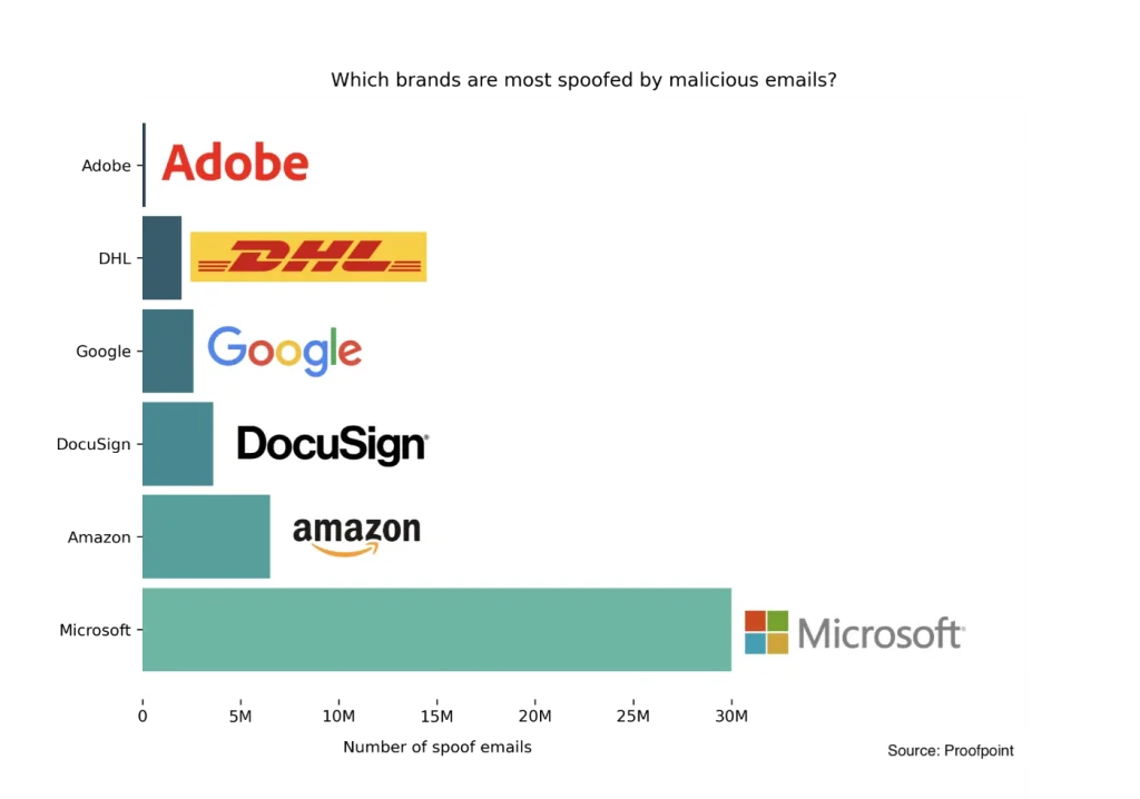 - Microsoft was the most spoofed brand in phishing emails in 2022, with upward of 30 million phishing messages identified using Microsoft branding (Proofpoint State of the Phishing). The next most spoofed brands include: