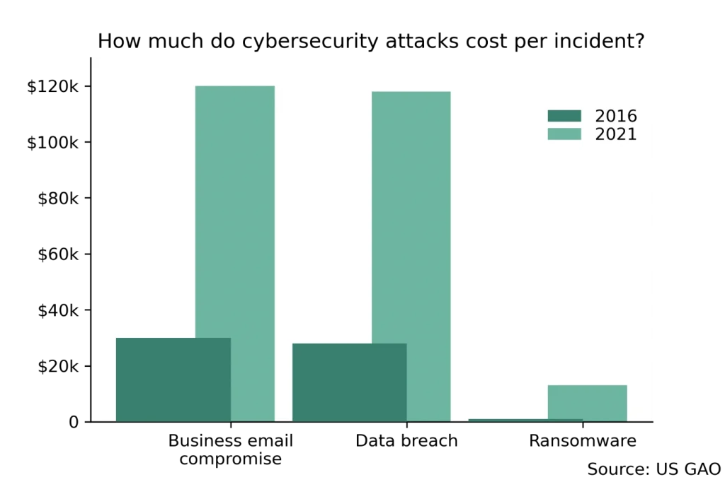 - The cost-per-incident for a business email compromise attack in the United States increased by a factor of 4 between 2016 to 2021, from $30,000 to $120,000 (US Government Accountability Office)