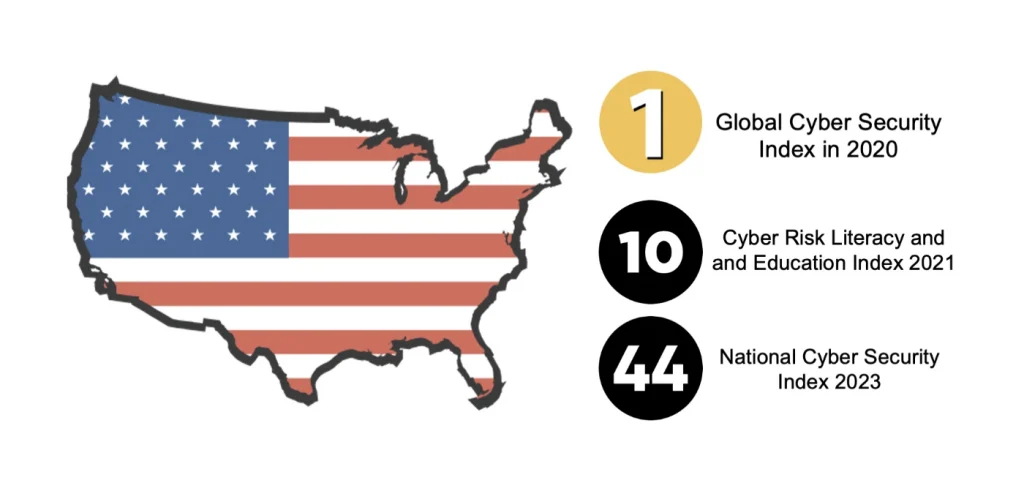 - However, the US ranked on 44th in the National Cyber Security Index 2023, due to especially low scores in protecting digital and essential services (NSCI 2023)